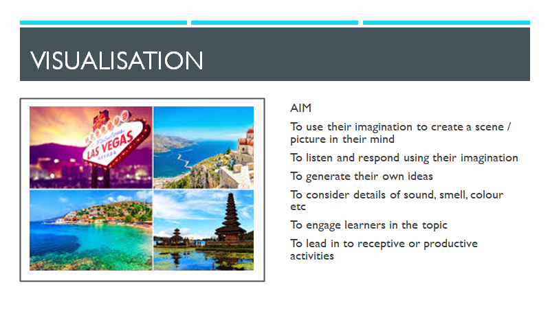 The next activity is visualisation. This is not a drama technique per se but it is a useful way of encouraging the learners to use their imagination. We can start by stimulating interest by using photographs and we tell them that the characters that they have created in the previous activity are going to go on a holiday.