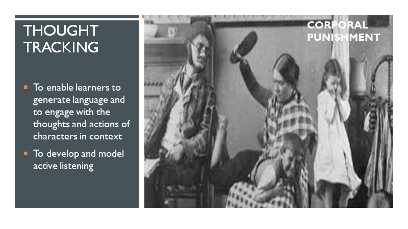 The next activity is called ‘thought tracking’.  The teacher can start with a photograph of an interesting scene. For example here is a picture related to the theme of corporal punishment. I chose this because it links to the character of the boy crying and how he was punished by his mother. The learners look at the photograph and then create a frozen image (tableau) so one learner can be the mother, another the boy, the sister and the father. The teacher now asks them to think about what they are saying or thinking in this scene. Then the teacher or one of the learners can tap each of the characters in turn on the shoulder and they verbalise what they are thinking or what they are saying in the scene. This can be extended to a short sketch or dramatised scene. This activity allows learners to generate their own language and to engage with the thoughts and actions of characters in a certain context. It develops listening skills as well as speaking skills.