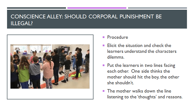 This leads us into the next activity which is called ‘the conscience alley’. In this activity you give the learners an ethical question for example if we continue in the same theme the question could be: ‘should corporal punishment be illegal?’ Put the learners standing in two lines facing each other and one side agrees with corporal and the other side disagrees and think that the mother shouldn’t hit the boy and Corporal punishment should be illegal. One of the learners can be the mother and you ask them to walk down the line of learners through the conscience alley and the learners whisper their opinions to the mother as she walks down. When the mother reaches the end of the conscience alley she can decide which side she thinks won the debate and the reasons why she chose that side.
