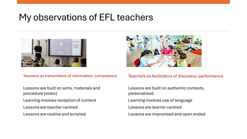 Within the realm of English as a Foreign Language (EFL) teaching, these philosophical orientations manifest in two distinct models: the competence model and the performance model. The competence model aligns with a positivist perspective, where teachers act as transmitters of information, and lessons are structured around predetermined aims and materials. In contrast, the performance model, rooted in constructivism, views teachers as facilitators of discovery, guiding learners through authentic, personalized learning experiences that prioritize language use and interaction.